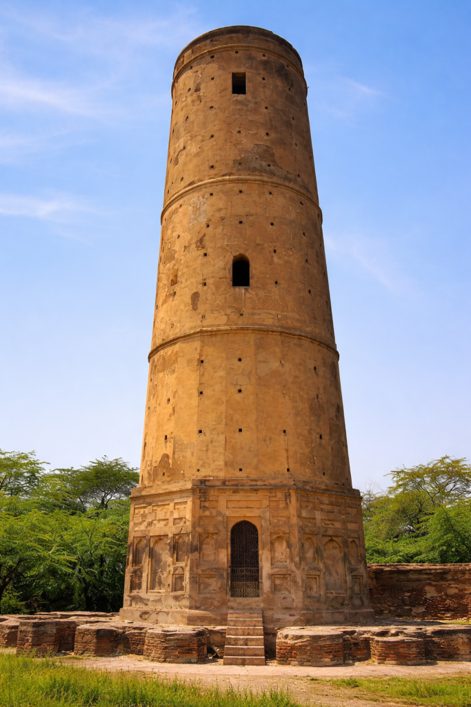 The main tower (minar) was built around 1606 CE, shortly after Mansraj’s death. The tower stands approximately 30 metres tall and is constructed from baked bricks with intricate ornamentation. A circular staircase inside leads to a viewing platform at the top, which historically offered panoramic views of the royal hunting grounds.